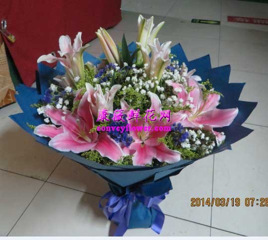 粉色百合5支,满天星,黄莺,蓝色包装 鲜花订购