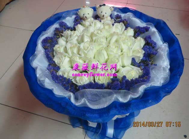 11朵白玫瑰,勿忘我,蓝色包装