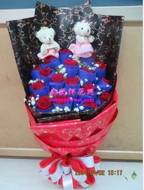 19支红玫瑰,单支蓝色包装,2个小熊,扇形包装!鲜花订购
