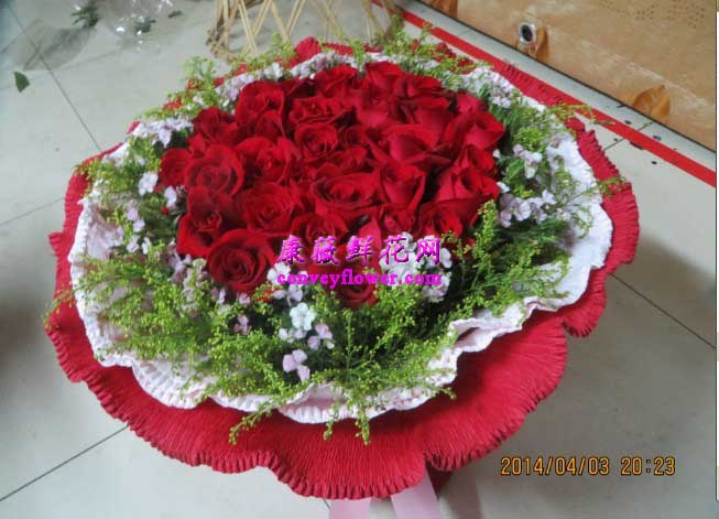 33支红玫瑰,黄莺,红色卷边纸包装,鲜花速递