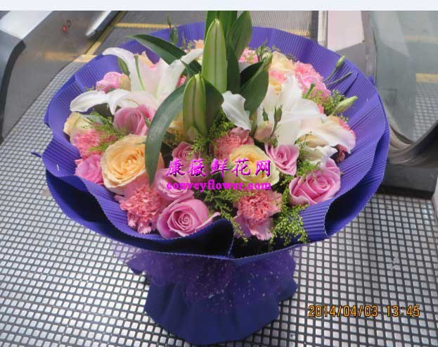 粉玫瑰,百合,黄莺,康乃馨,蓝色包装 鲜花订购