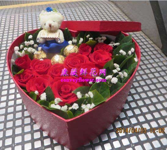 鲜花 11支红玫瑰,巧克力,满天星,心形盒装