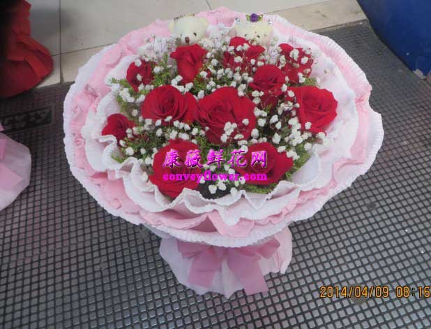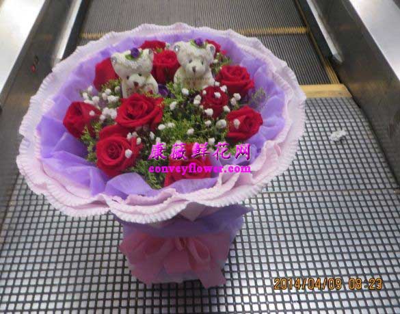 红玫瑰11支,2小熊,粉色包装,满天星,2014224 平安夜送花