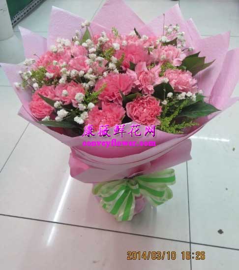 康乃馨33支,满天星,绿叶,黄莺,粉色包装!圆形