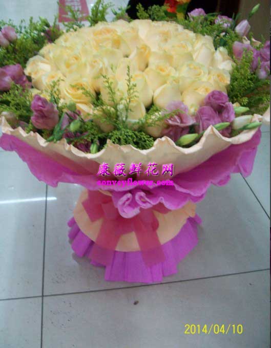 香槟玫瑰99支,紫色玫瑰5支,黄莺,粉色卷边纸圆形包装!