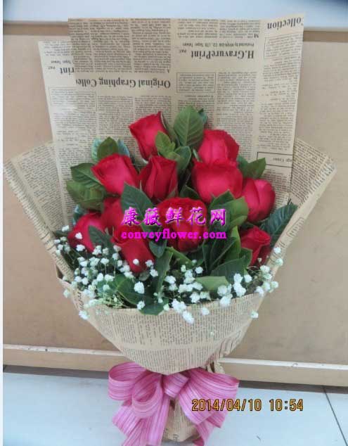 11支红玫瑰,绿叶,英文报纸斜面包装! 2014圣诞节送礼物