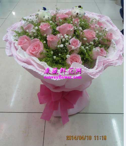 粉玫瑰11支,2小熊,黄莺,圆形包装 2014年圣诞节送粉玫瑰