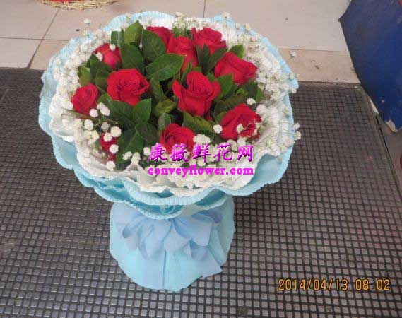 11支红玫瑰,绿叶,满天星,蓝色包装