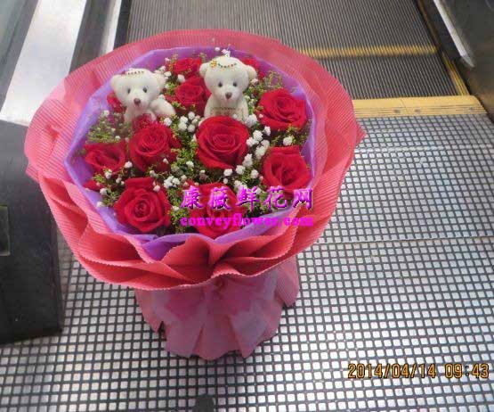 红玫瑰11支,2小熊,黄莺,满天星,红色包装